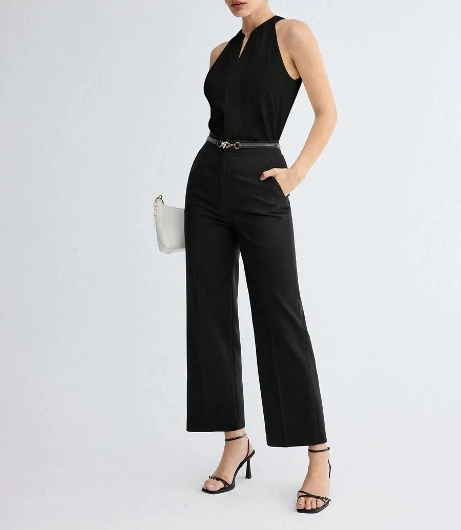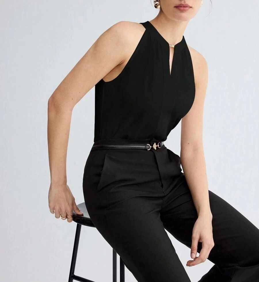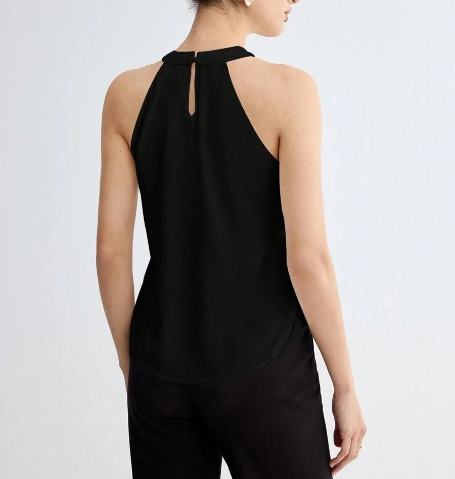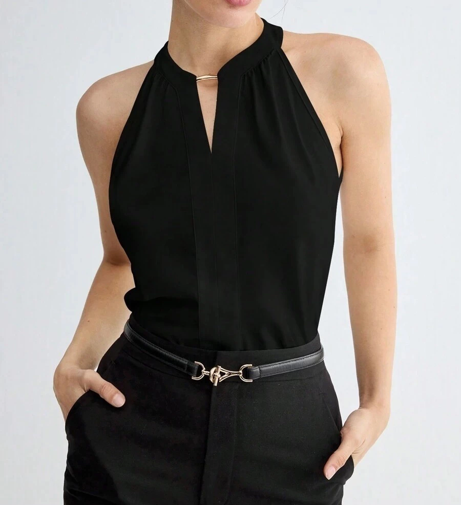 Descripción: Blusa cuello alto con adorno dorado, hombros descubiertos, cierre con boton, tela no elástica.