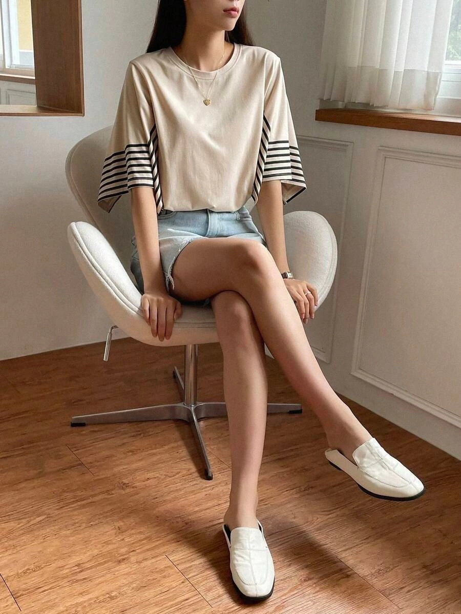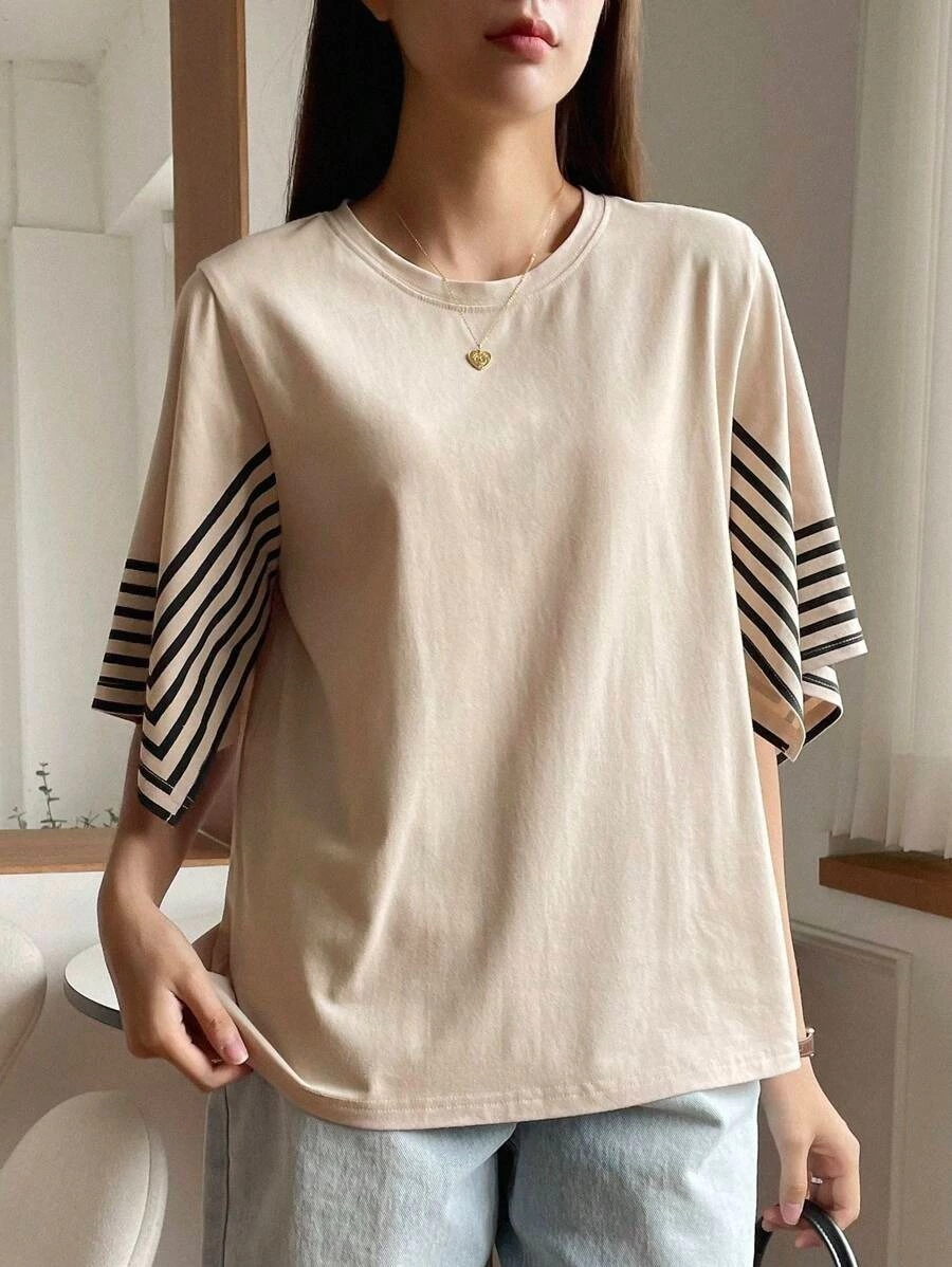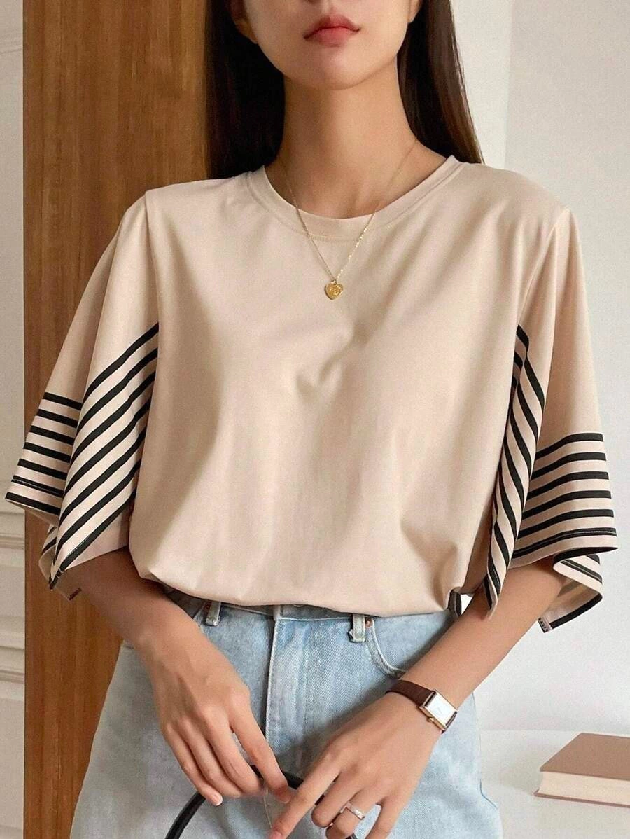 Descripción: Blusa cuello redondo, corte recto, mangas abiertas con diseño de rayas, largo asimetrico, tela ligeramente elastica.