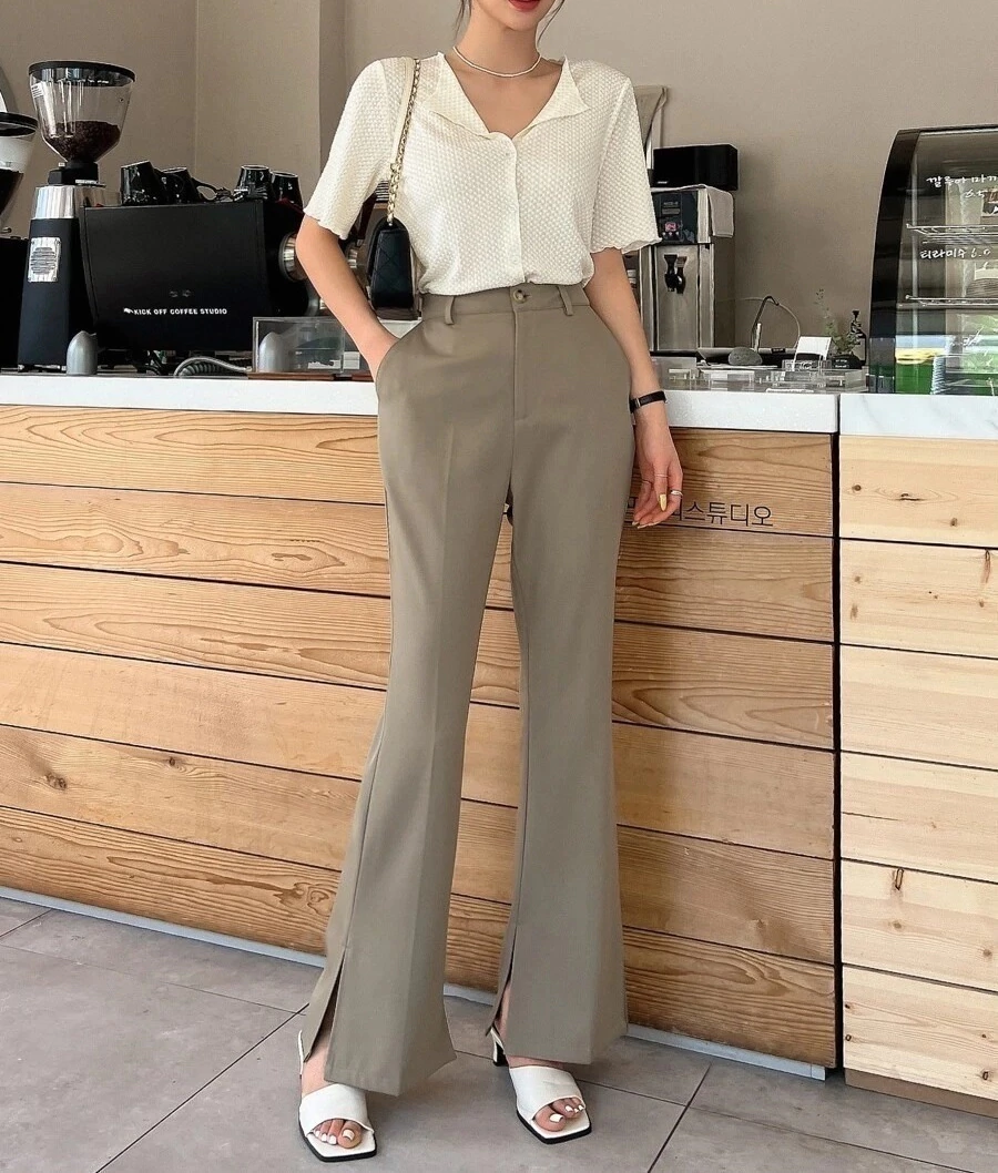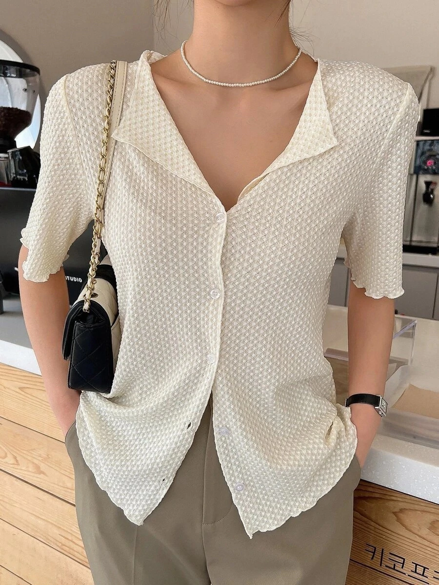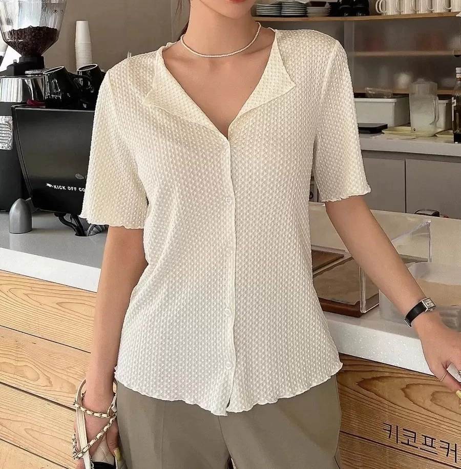Descripción: Blusa cuello camisero botones adelante, corte recto, manga corta, tela con textura medianamente elastica.
