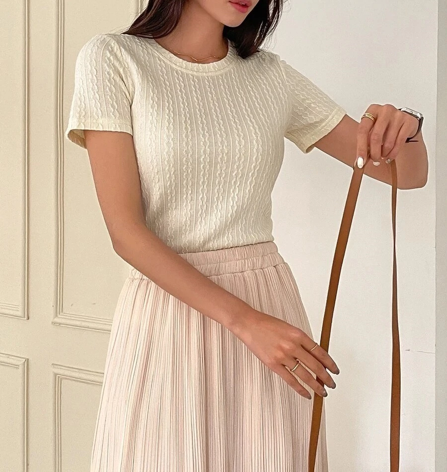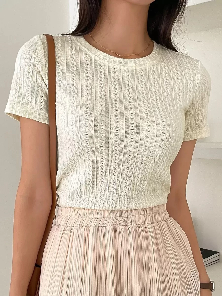 Descripción: Blusa cuello redondo, tela medicanamente elastica con textura, manga corta.