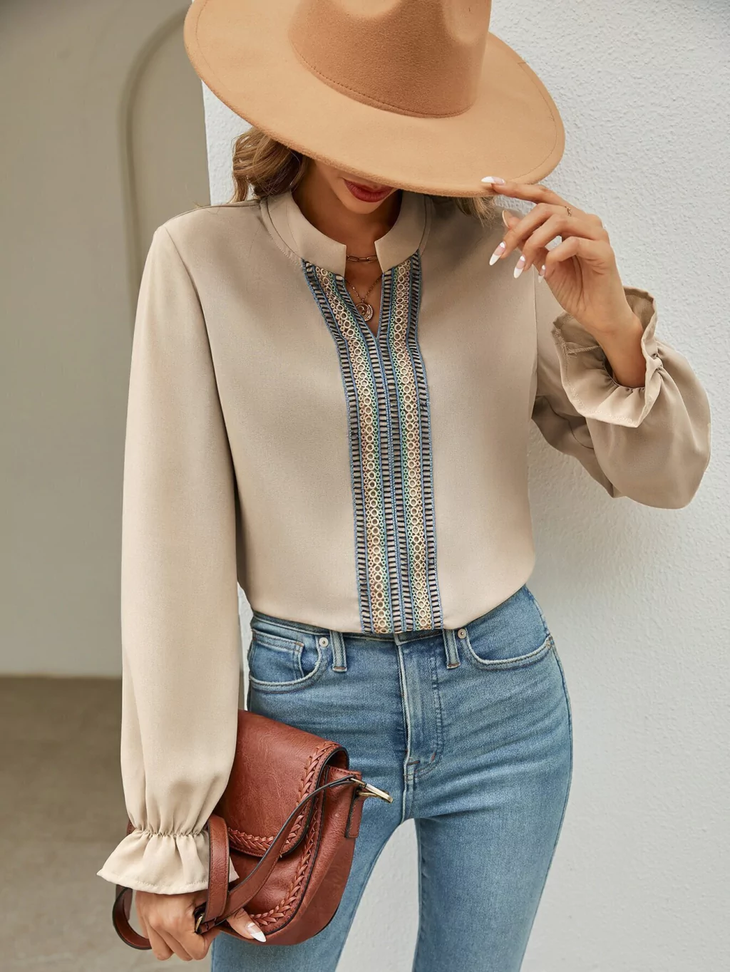 Descripción: Blusa cuello V, encaje en contraste, corte recto, resorte en manga, tela no elástica.