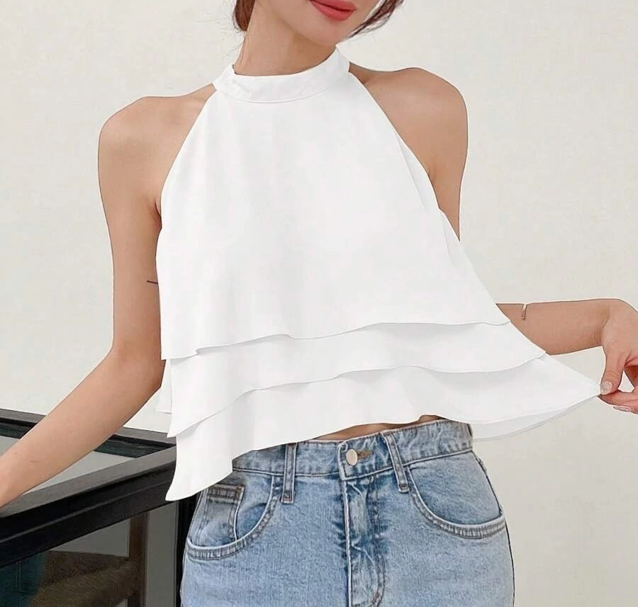 Descripción: Blusa cuello alto, hombros descubiertos, cierre con cremallera, capas en torso, tela no elástica.