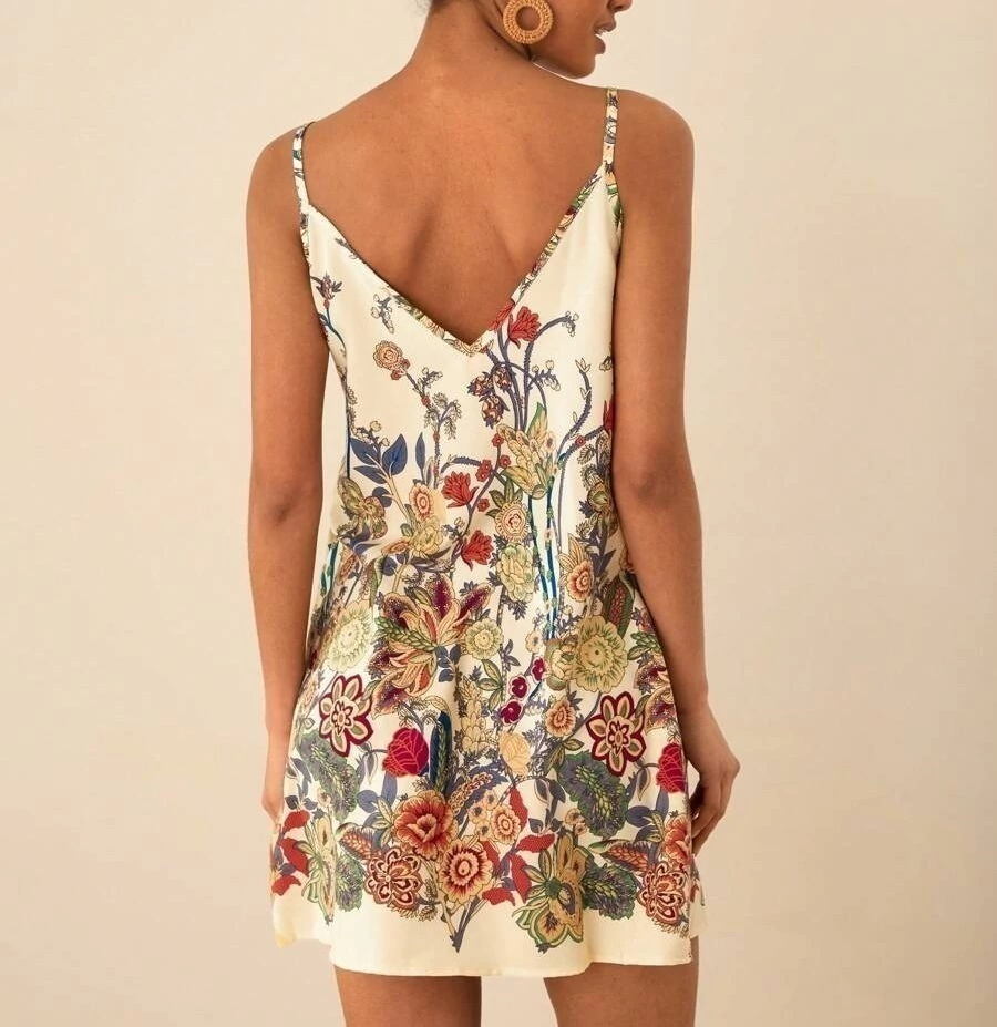 Descripción: Vestido corto, escote profundo en V, tiras finas en hombros, falda linea A, tela no elástica.