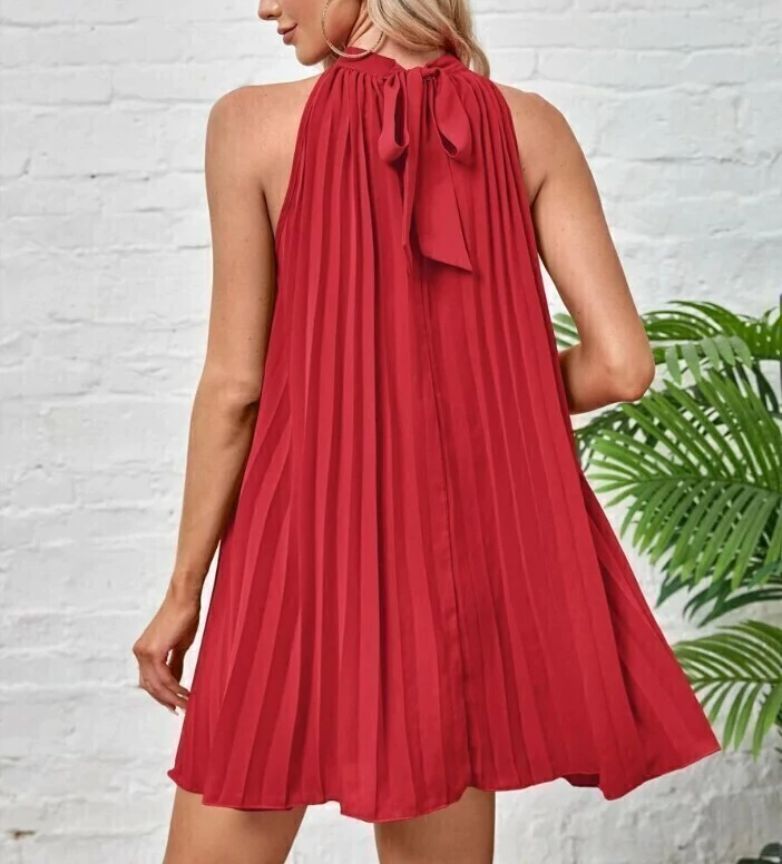 Descripción: Vestido cuello alto, plisado, ajuste con lazo, linea A, tela no elástica.