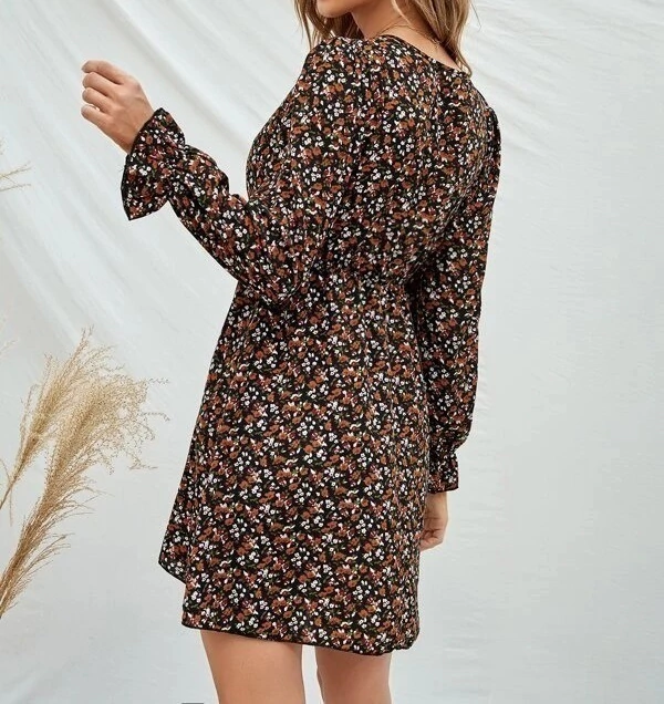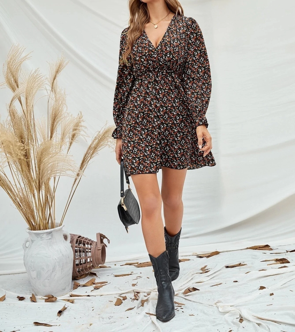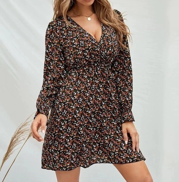 Descripción: Vestido cuello V escote profundo, resorte en cintura y puño, talle alto, falda linea A, tela no elástica.