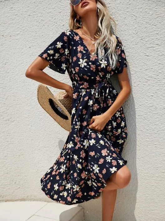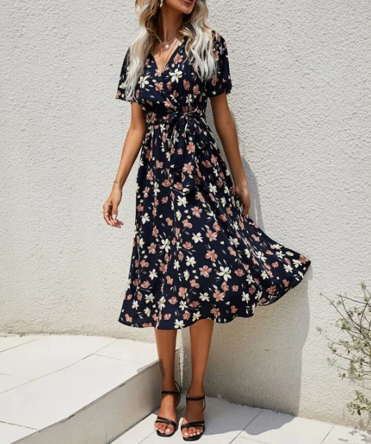 Descripción: Vestido midi, cuello V escote cruzado profundo, talle alto, resorte en cintura, falda campana. No elástico.